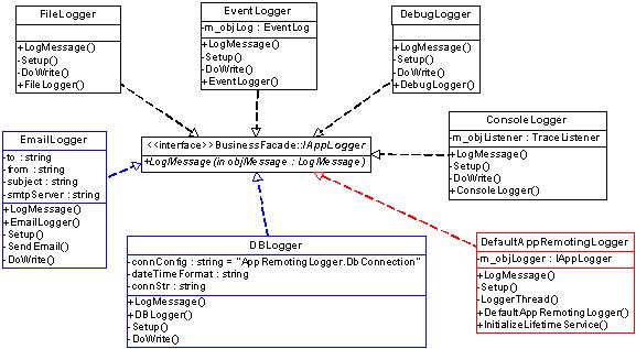 Client & Server Side共享AppRemotingLogger::BusinessFacade。Client只需要引用AppRemoting.BusinessFacade.dll,任何在BusinessRules和DataAccess层的修改对Client端没有影响。Server端可以根据需要修改Logger的类型。