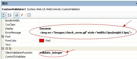 其实也就是把错误消息从平时所使用的普通文本信息改为一张图片,不同的是需要将其Display属性设置为动态(Dynamic)显示,ClientValidationFunction设置为在客户端定义好的JavaScript方法便可。客户端编码如下: