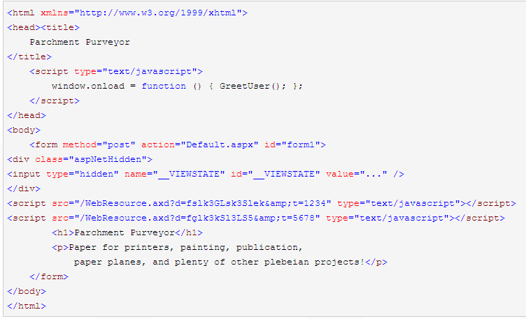 请注意引用“WebResource.axd”的两个<script>标签。它提供了让客户端访问嵌入式信息的基本功能。注意,第一个<script>标签注册了ShowMessage(),第二个<script>标签注册了GreetUser()。在你的JS库中调用Include_GreetUser()时,上面所有标签都会被引入到页面中。