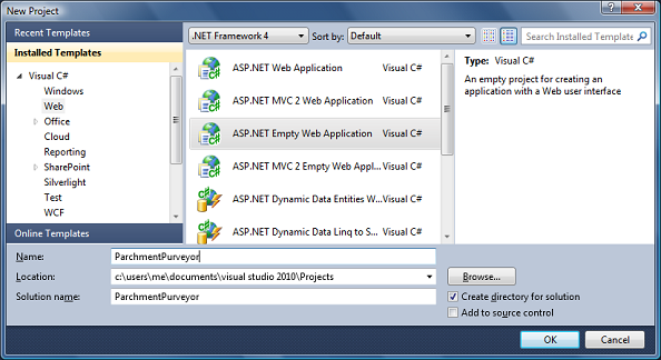 第一步,启动Visual Studio 2010,并新建一个名为ParchmentPurveyor的空Web程序。