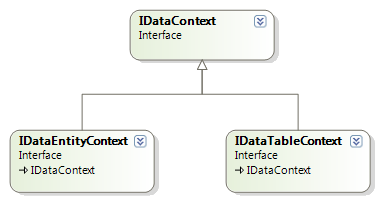 基于此,Richard就把IDataContext定义为一个接口声明,然后再定义了IDataEntityContext,和IDataTableContext来继承IDataContext,他们的关系图如下: