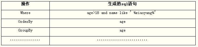b. 解析条件对象。在上面的构造的条件对象中,Age,Name等,都是业务类User的字段,这些字段的值肯定最终是从数据库中的表字段中获取的(或者是通过数据库中的值算出来的),所以在解析条件对象的时候,就要知道这些业务属性对应数据库中哪个表的哪个字段。因此在业务类中声明每个属性的时候就要同时保留它所对应的数据库字段的信息。一旦业务类的属性中保存了这些信息