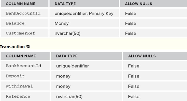 下面就开始创建保存数据的数据库,和以前一样,为了演示的作用,我们在Web project中添加一个名为BankAccount.mdf的数据库,并且建立如下的表:
