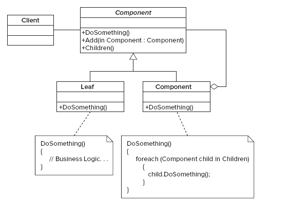 看到上面图,其实大家也可以想想在ASP.NET页面的生命周期中到处都是这种例子:例如在ASP.NET页面的Init事件中,因为Page本身就是一个容器,这个容器里面包含了很多的其他的控件,如Panel,Button,而且Panel里面还是控件。那么在Init方法就会调用自己的子容器的Init方法,然后子容器在调用自己的子容器的Init方法,这样就层层调用,直到最后调用到某个控件的Init的方法。这样这个页面的初始化就完成了。和上面的UML的结构是一样的。
