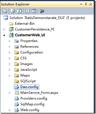 SqlMaps节点这时指定了映射文件的路径. 到了这儿忘了说一下CustomerWeb_UI项目需要添加的引用: