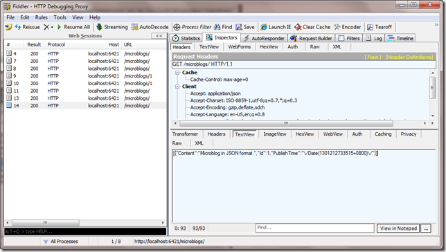 Model.Context.tt和Model.tt分别是Container和Entity的T4模板。现在再运行一下服务,获取所有微博: