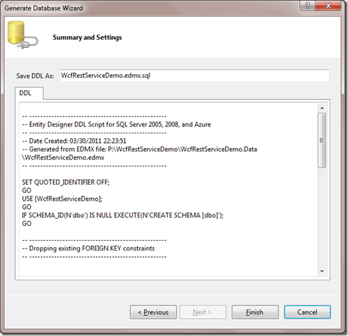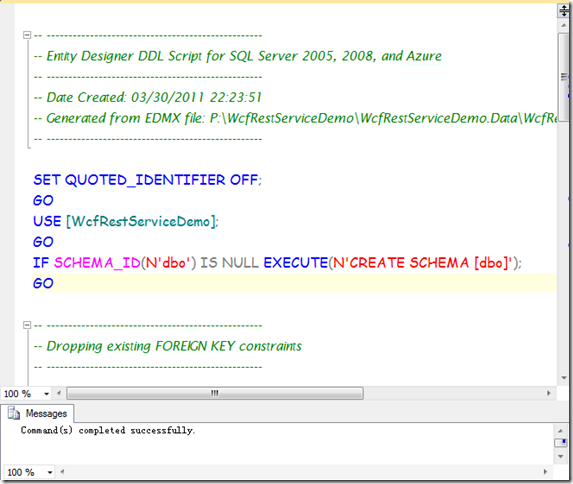 打开WcfRestServiceDemo.edmx.sql,右键选择Execute SQL,成功后模型就同步到SQL