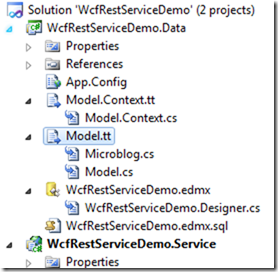 删去Microblog.cs,添加对WcfRestServiceDemo.Data和System.Data.Entity的引用,并修改MicroblogService.cs代码如下: