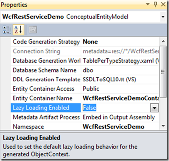 Data Model启用了LazyLoading和Proxy机制的缘故。这两个特性我以后也许会详细讲,不过目前我们只要把它们关闭就好。虽然Model设计器提供了下面这个属性可以修改:
