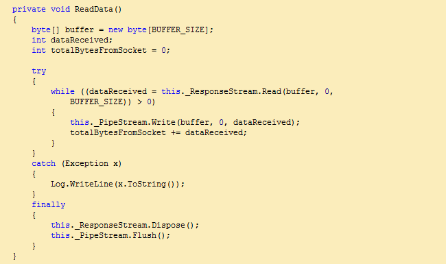 这里,读取是在PipeStream上进行的,而不是从asp.net线程的socket上。这里有一个新线程被催生,它将数据写入PipeStream就像它从外部站点下载字节一下。结果,我们有asp.net线程持续地将数据写入OutputStream,并且有另外一个线程从外部服务器不断地下载数据。接下来的代码从外部服务器下载数据,然后存储到PipeStream中。