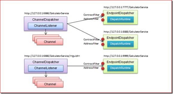 针对这两个信道监听器,WCF会创建相应的信道分发器(ChannelDispatcher)对象。而针对在配置中定义的三个终结点,它们则分别对应着一个终结点分发器(EndpointDispatcher)。每个终结点分发器分发器都具有各自的运行时,被称为分发运行时(DispatchRuntime)。