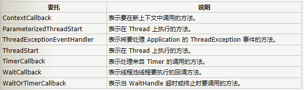 在System.Threading中的包含了下表中的多个常用委托,其中ThreadStart、ParameterizedThreadStart是最常用到的委托。