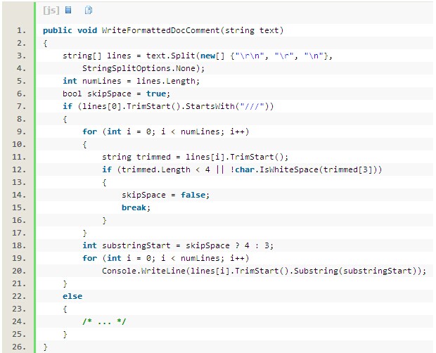 可以看到,在这片代码中包含有很多字符串操作。代码中使用类库方法来将行分割为字符串,来去除空格,来检查参数text是否是XML文档格式的注释,然后从行中取出字符串处理。