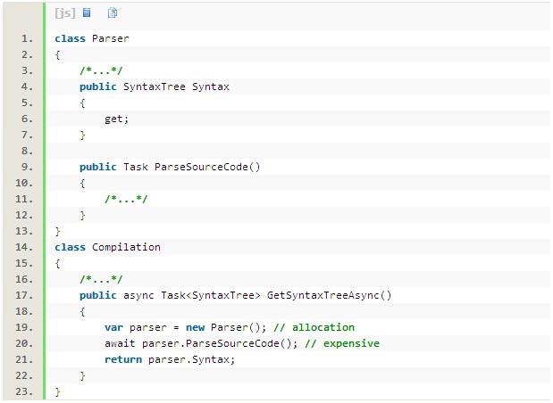代码中有一个SynataxTree类型的名为cachedResult的字段。当该字段为空的时候,GetSyntaxTreeAsync()执行,然后将结果保存在cache中。GetSyntaxTreeAsync()方法返回SyntaxTree对象。问题在于,当有一个类型为Task<SyntaxTree> 类型的async异步方法时,想要返回SyntaxTree的值,编译器会生出代码来分配一个Task来保存执行结果(通过使用Task<SyntaxTree>.FromResult())。Task会标记为完成,然后结果立马返回。分配Task对象来存储执行的结果这个动作调用非常频繁,因此修复该分配问题能够极大提高应用程序响应性。