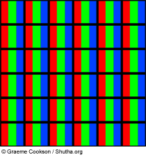 无论是早期的CRT显示器还是如今的LCD显示器,都是基于点阵的。也就是说通过一些列的小点排列成一个大的矩形,不同的小点通过显示不同的颜色来显示成图像。比如下图就是LCD显示器上一个6x6个小点排列成的矩阵: