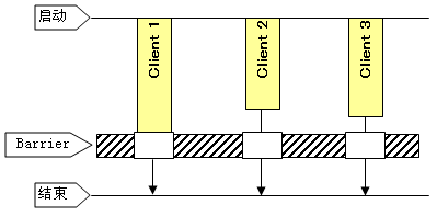 借用PNUNIT的概念Barrier,也就是异步过程中的同步点,进到Barrier里的所有对象都要等待其他对象进入。这些对象可以是不同的线程,进程(不同PC,不同语言实现的客户端),过程如下图:3个客户端启动之后,有快有慢,但是在Barrier处进行一次同步,先到的等待后到的。