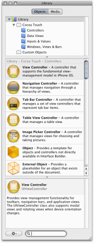 下一个窗口是Library。Library包含了所有能在设计界面上使用的Cocoa