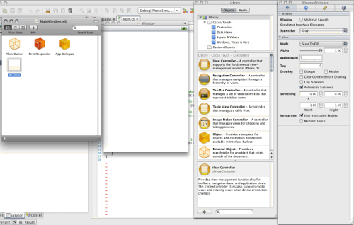 Touch对象的所有属性。也可以用它来设置可视化属性、布局等等。在创建Outlets和Actions时也用得着它,这个主题后面会谈到。在下面的图片中,我们在Document窗口中选择了Window对象,所以我们可以查看这个对象的相关属性。