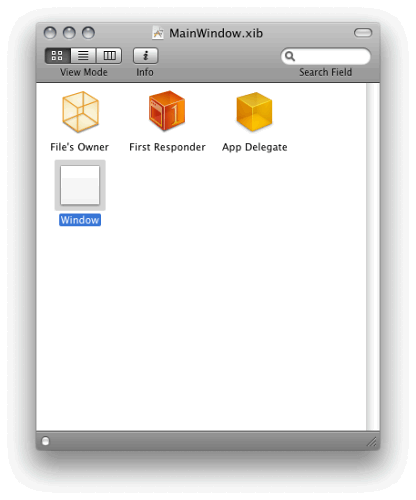 这个窗口显示了在.xib文件中的所有对象。这是默认的视图,你会发现它虽然样子漂亮,但没有太大用处,因为你的对象实际上是层级排列的,而图标视图只能同时显示一级。在我们添加控件到界面上的时候,它不会显示在这个视图中。所以,我们需要通过点击View