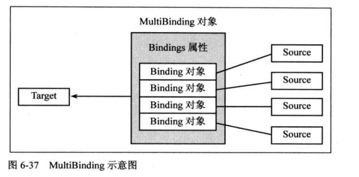 有时候UI需要显示的数据来源不止一个数据来源决定,这个时候就需要用到MultiBinding,即多路绑定。MultiBinding与Binding一样均以BindingBase为基类,也就是说,凡是能用Binding的场合都能使用MultiBinding。MutiBinding具有一个Bindings的属性,其类型是Connection<BindingBase>,通过这个属性,MultiBinding把一组Binding对象聚合起来,处在这个Binding结合中的对象可以拥有自己的数据校验和转换机制。它们汇集起来的数据将共同决定传往MultiBinding目标的数据。如下图: