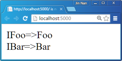 在Startup的Configure方法中,我们调用ApplicationBulder的Run方法注册了一个Middleware,后者将两个注入的服务的类型作为响应的内容。当我们运行这个应用,并利用浏览器访问默认的监听地址(http://localhost:5000)时,浏览器会将注入的两个服务对象的类型以下图的方式展现出来。