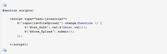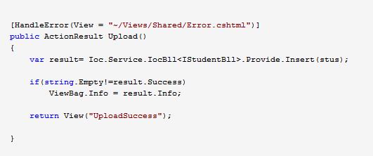 红色部分是我新增加的Action操作,前面说了竟然创建的form表单是上传文件到服务器的,那么这个操作就是处理上传文件用的Action,因为它会改变服务器状态,所以我定义成Post方法。其余2个特性是配合@Html扩展方法用的,一个是防止跨站请求伪造(CSRF:Cross-site request forgery)攻击,一个是统一处理异常页。你也可以不加,跟我们今天的例子没关系。我们先不写这个Action操作的代码,让我们再次回到我们创建的视图页 。