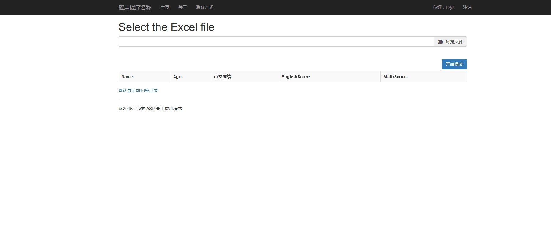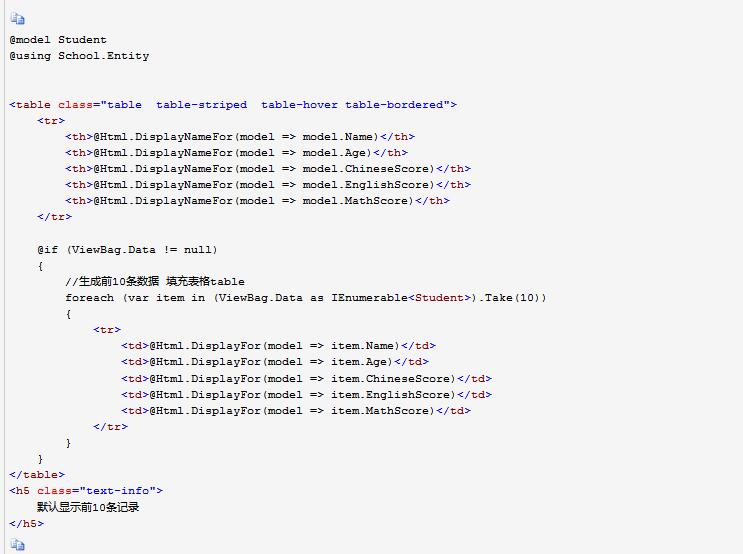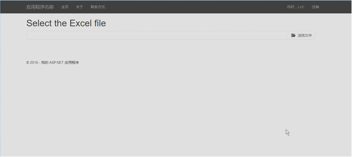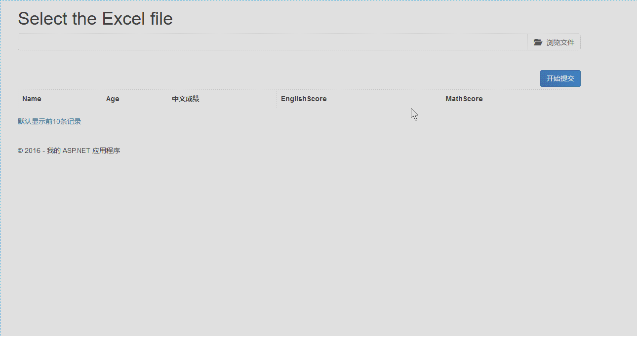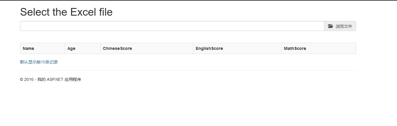 第五步 到了这里我们的文件已经可以上传到我们服务了,如果不信你在Browse操作打个断点,看看file参数是不是已经接受了文件,如果接受到了说明已经成功一半了!我们还是先不写Browse操作处理Excel文件的代码,焦点还是在视图页上,在本博客第一张效果图里,大家看到浏览文件下面有张table表格吗?小弟创建这个表格只是为了更好的交互效果,让使用的人更直观而已。而且也很简单! 接下来我们来构建它,在视图页新增table表格的代码