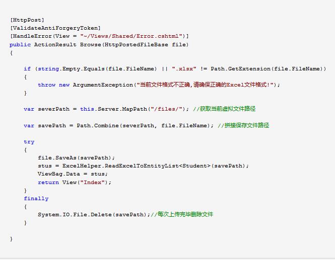 看见form表单的 action="/UploadExcel/Browse",所以我们还要在UploadExcelController控制器里创建第二个名称叫Browse的Action操作