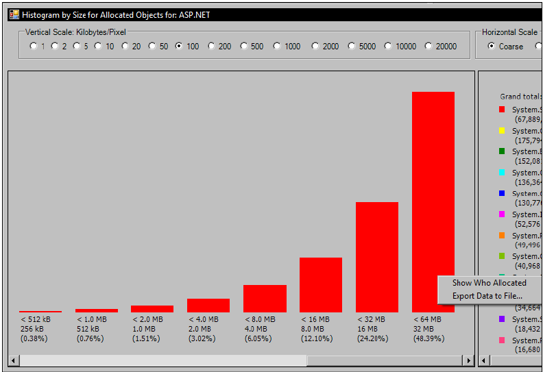 6. 我们还可以点击”Histogram”按钮。这个界面展示了不同大小以及不同类型的对象所占的比例。下面对看出,系统中有很多的string对象,也就说,系统中的string类型的对象占据了系统大部分的内存空间。