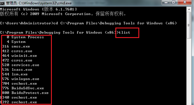 WinDbg是默认的调试工具,但是在工具箱中还有几个控制台调试工具,他们行必之下比较轻量简单,有些任务比较好执行,在配合cmd使用会很方便,比如工具箱中的tlist.exe用来查看进程信息的小工具就非常方便。