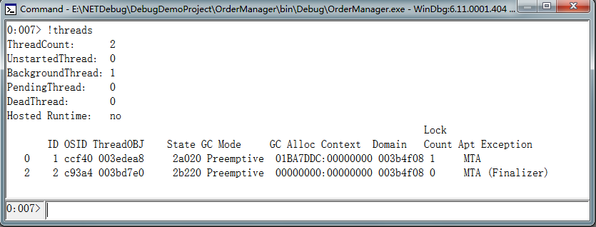 使用!Threads命令可以查看进程内所有的托管线程,仅仅是托管线程,此命令是无法查看非托管线程的,接下来我们使用另外一个命令来查看所有的线程。