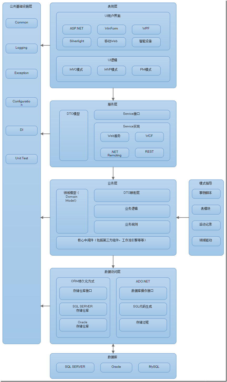公共基础设施层可以包括Common通用模块,Logging日志模块,Exception异常模块,Configuration配置模块,DI依赖注入模块,单元测试模块以及第三方组件(例如NHibernate、Sprint.NET、Castle、Quartz计划任务等等)