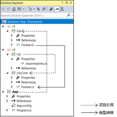 上图中的虚线箭头和实线箭头分别代表项目之间的引用关系,我们从中可以看出v2目录下的Lib项目具有对Lib.Core项目的引用,因为它需要引用转移到Lib.Core项目中的类型。为了完成针对类型Foobar的转移,我们只需要在v2\Lib中定义如下一行简单的代码就可以了,我们将这行代码定义在AssemblyInfo.cs文件中。