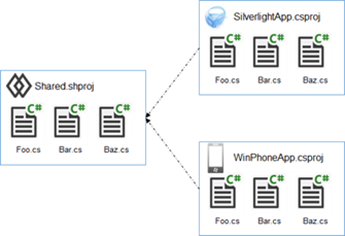 如上图所示,我们可以创建一个Shared Project类型的项目Shared.shproj,并将需要共享的三个C#文件(Foo.cs、Bar.cs和Baz.cs)添加进来。我们将针对这个项目的引用同时添加到一个Silverlight项目(SilverlightApp.csproj)和Windows
