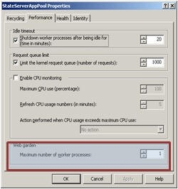 右键单击程序池->Performance(性能?)选项卡->选择Web Garden(Web园)部分