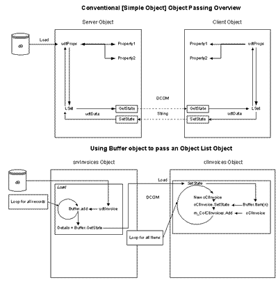 例子 在上面的讲解中,我们做足了思想动员工作,我想我们还是得真刀实枪地来点实际的。由于单个对象的传递过程比较简单,我们在这里仅以类集合对象为例来讲解。首先在客户端组件(也就是下面的clInvoices Object)的Load方法中,创建一服务器端组件(srvInvoices Object)实例,并调用它的Load方法。我们看到,服务器端组件对象的属性字符串是通过参数strDetails传回到客户端的。