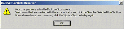 Update(更新)按钮以提交纠正后的行。如果不再存在冲突,而且也不应该再存在,您将收到一条消息,提示已成功完成更新。如果完成了所有操作,可以退出示例应用程序,通过从