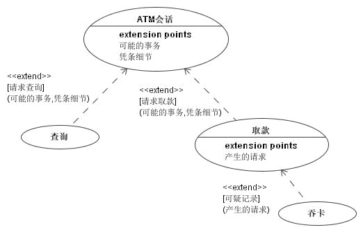 看到这里,我们就不难解释为什么图2把ATM会话与取款之间的关系画成扩展了(注:这本身可能不符合亚克申扩展用例的原则[4])。由于在身份验证通过后,顾客具体执行什么操作是不定的,可以是取款、存款、转账、查询等事务中的任何一个,将来甚至还有可能添加(扩展)新的功能,而ATM打印的凭条根据用户操作的不同,内容也将有所不同。这些内容的发生都需要具备一定的条件,属于可能的情况,这一点似乎很符合扩展用例的定义。考虑到这些因素,作者于是采用了图2的策略,把可能的操作和打印内容都从基用例中抽走。