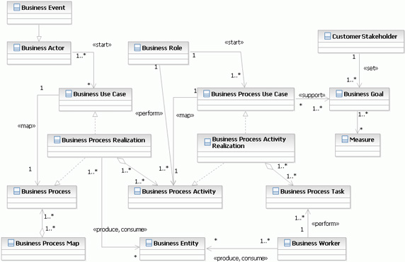 - Business Processes (业务处理过程)同 Business Actors (业务活动者)所开启的 Business Use Cases (业务用例)是一一对应的。
