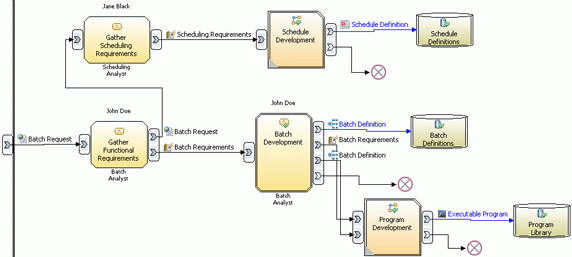 图 5:WebSphere Business Modeler 中的 Batch 和 Schedule Development 业务处理过程。