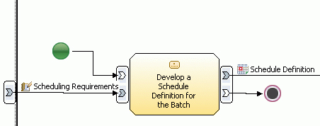 特别地,图 5 显示了一个示例 Batch 和 Schedule Development 的业务处理过程。为了更好的描述在 WebSphere Business Modeler 中建模的可能性,并且理解每一项是如何被转化到 UML 的,这个例子显示了如下内容:
