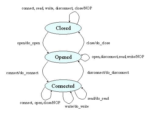 在下面的状态图中我们考虑三种状态以及六种输入讯息 (事件),这三种状态是 Closed, Opened, 及 Connected,六种讯息是