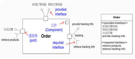 - 例,Order 组件提供(provided)给 Client 端(如 Customer) “新增/移除 订购细项”、”完成订购”、”提供订购追踪信息” 等接口;而需要(required) “Retrieve Products”、”Retrieve tracking info” 等界面。