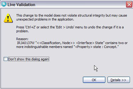 如果这个 Rational Asset Manager 配置包含在复件中,比如分类计划都是一样的,那么 Rational Software Architect 或者 Rational Software Modeler 就会通知您复件实在这个 UML 模型中,如图 22所示。