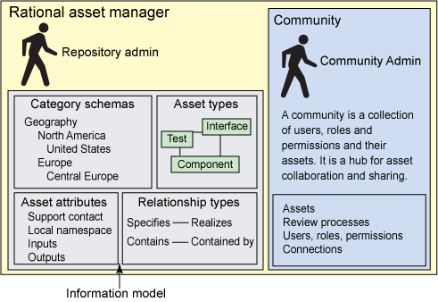 当在 Rational Asset Manager 中配置分类方案,资产类型,资产属性,以及关联关系类型时,这些交付的变更在这个储存库中很快就变得可利用而且生效。然而,企业通常会一段时间来讨论并对 Information Model 的结构做出决定。使 Information Model 条目之间相互沟通的形式之一是使用模型。利用一个 UML 模型开描述 Information Model 的元素,从而提供这个配置的可视性。