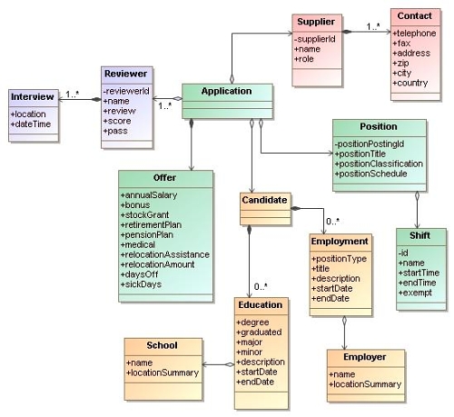 工作申请生命周期本身独立于任何Candidate-to-Employee业务过程。这是一块很少变化的业务逻辑,即使与之交互的过程可能经常变化。一家公司可能有几个这样的过程为这个相同的生命周期服务:例如,一个用于副总裁职位,一个用于经理,一个用于其它所有的员工。另一种情况可能是因为规章制度,一些过程可能涉及额外的活动(检查背景……)。这些过程变体是非常平常的。但是,在很大程度上一个工作申请就是一个工作申请,即使也存在一些工作生命周期变体,它们在很大程度上与它们的过程变体没有瓜葛。