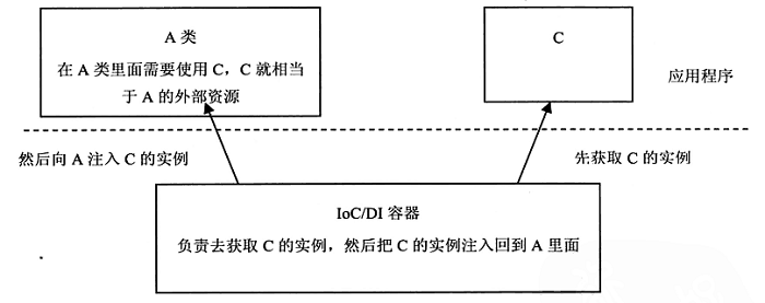 当有了IoC/DI的容器后,A类不再主动去创建C了,而是被动等待,等待IoC/DI的容器获取C的实例,然后反向注入到A类中。