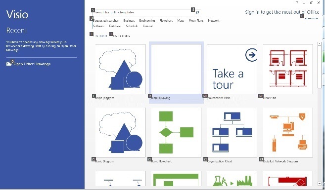 Visio最初属于Visio公司,2000年1月7日,微软公司以15亿美元股票交换收购Visio。本人在大学的时候用过visio2003,写论文时画一些基本的示意图,还用它画过电路图;在公司的时候用过visio2007,画的是用例视图和流程图;现在为了写这篇博客,我装了visio2013,。感觉visio2013的设计风格大换血,女孩子应该喜欢,但是我还是感觉visio2007更好使一些。visio2013的样子如下: