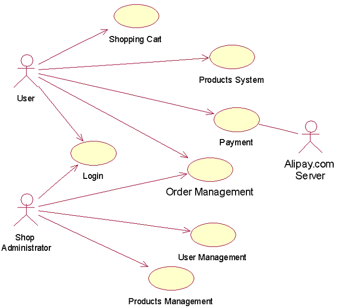 虚拟商品在线交易系统的用例图如图2-1所示,包括:用户登陆系统、商品展示系统、购物车、结算付款、支付宝服务接口、用户及定单管理系统、商品管理。