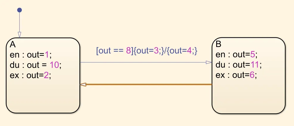 (2)状态转移到B,执行转移动作out = 5 (3)激活状态B,执行状态B的entry动作 out =